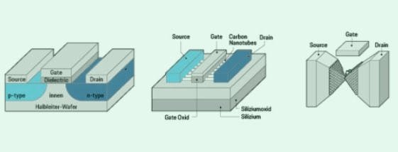 由于量子力學(xué)隧道效應(yīng),電子可以穿越絕緣體,這將使元件功能失效。人們開始尋找一種新型晶體管,可以進(jìn)一步提高未來集成電路的性能,作為傳統(tǒng)晶體管的替代品。目前有很多研究,但還沒有領(lǐng)先者可以取代硅MOSFET。研究人員列出了一系列MOSFET替代品,包括隧道場效應(yīng)晶體管TFET,碳納米管場效應(yīng)晶體管,單原子晶體管。