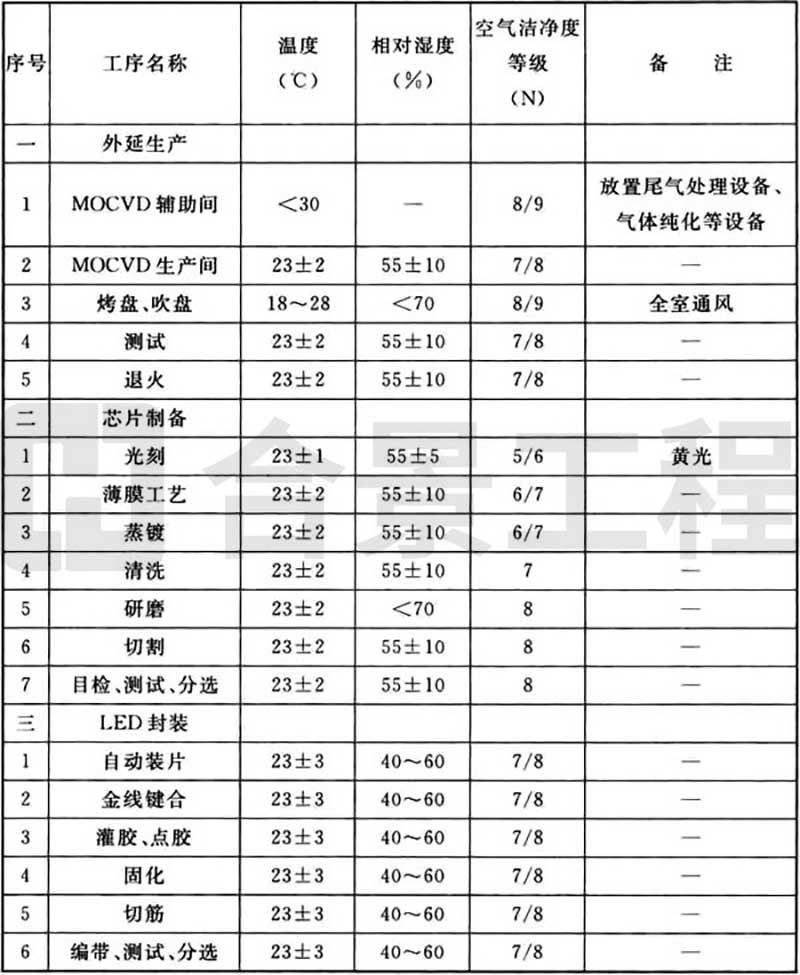 注:1 發光二極管制造設備可按防靜電工作區設計分級三級標準設計;